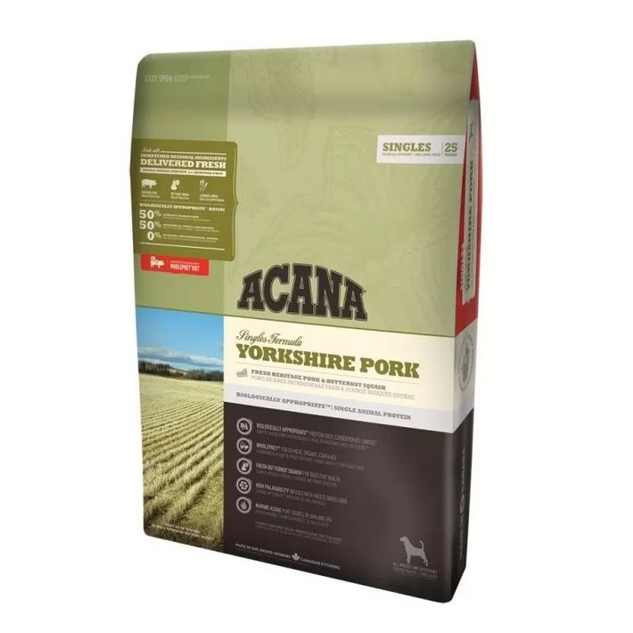 A könnyen emészthető, ízletes vörös hús az egyetlen állati fehérjeforrás, ezért allergiagyanú esetén is tökéletes választás, például egy eliminációs-provokációs diétához. A táp az összes fajta részére bármely életszakaszban adható. Az ACANA Yorkshire Pork párját ritkítóan sokféle helyi alapanyagból készült, melyeket a környező farmokon tenyésztettek és termeltek.