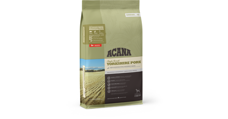 A könnyen emészthető, ízletes vörös hús az egyetlen állati fehérjeforrás, ezért allergiagyanú esetén is tökéletes választás, például egy eliminációs-provokációs diétához. A táp az összes fajta részére bármely életszakaszban adható. Az ACANA Yorkshire Pork párját ritkítóan sokféle helyi alapanyagból készült, melyeket a környező farmokon tenyésztettek és termeltek.