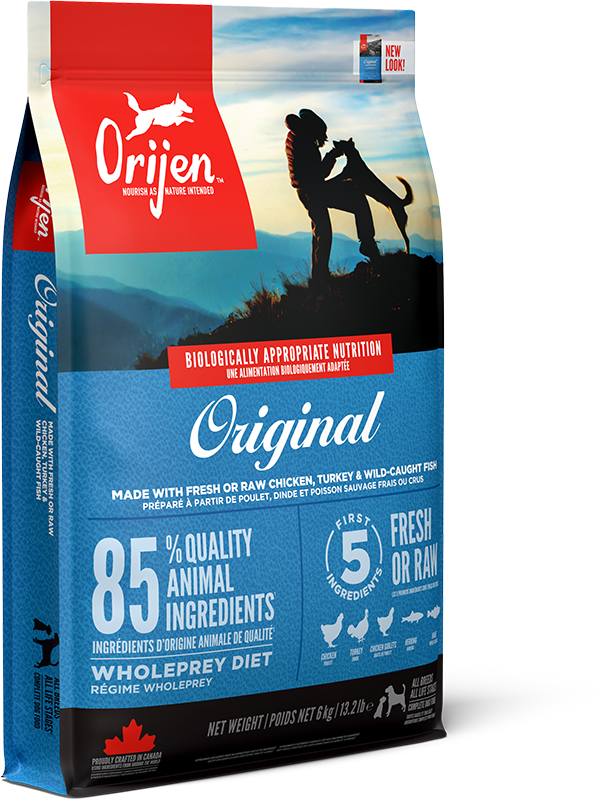 Hasonlóan a vadon élő őshöz, a szürke farkashoz, bármely fajta kutyának változatos húsokban bőséges táplálék a biológiai szükséglete. Az ORIJEN® Original alapanyagainak 85 %-a állati eredetű: szabadon tartott csirke és pulyka, vadon fogott vagy fenntarthatóan tenyésztett halak és tojás.