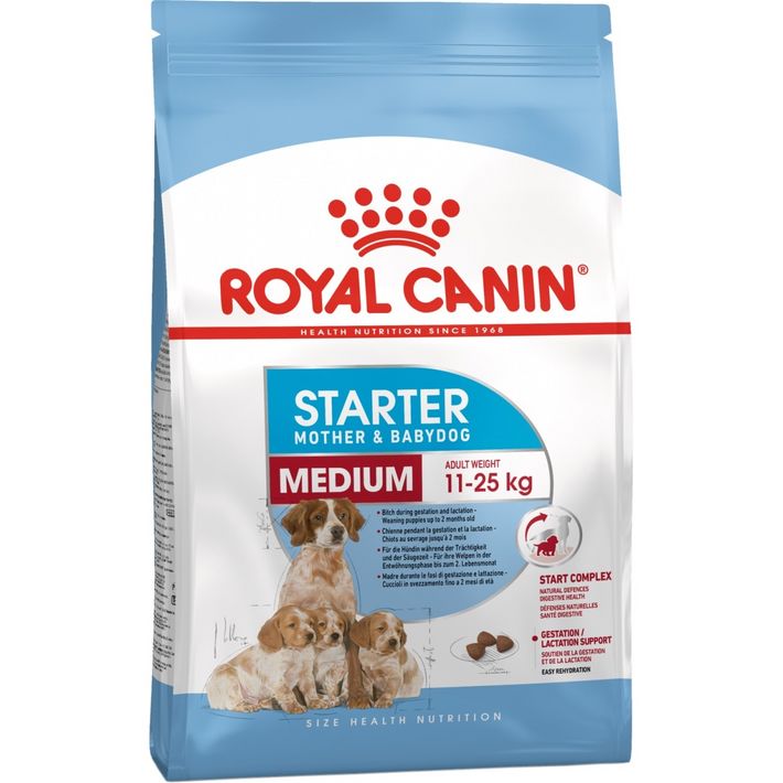 A Royal Canin Medium Starter Mother & Babydog kutyatápot kifejezetten olyan közepes termetű, 11-25 kg közötti szukáknak fejlesztették ki, akik vemhességük végén járnak, vagy a szoptatási időszakban, valamint kölyökkutyák számára az anyatejről szilárd táplálékra való áttérés idejére. A receptúra optimális tápanyagkomplexet tartalmaz C- és E-vitaminnal kiegészítve, és ezáltal támogatja az immunrendszer kifejlődését.