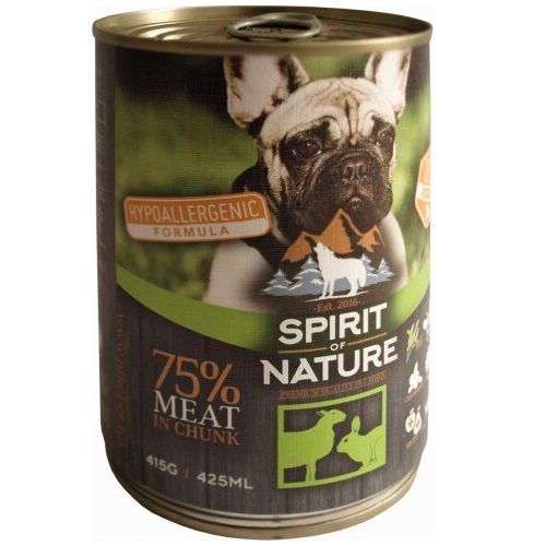 Teljes értékű hipoallergén nedves eledel, bárány és nyúlhús darabok szószban felnőtt kutyák részére. Válogatott alapanyagokból, magas hústartalommal, baromfihús és gabona felhasználása nélkül készült hipoallergén formula! A Spirit of Nature termékek nem tartalmaznak szóját, génmanipulált gabonát, mesterséges ízfokozót, színezéket, valamint tartósítószert és aromát sem.